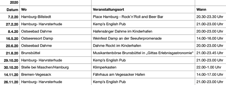 Hier sind unsere aktuellen Konzerttermine für das neue Jahr 2020. Wir würden uns freuen euch alle wieder so zahlreich bei dem einen oder anderen Konzert zu sehen. Wir haben neue Songs und wieder einige Überraschungen im Programm. Das Kommen lohnt sich!